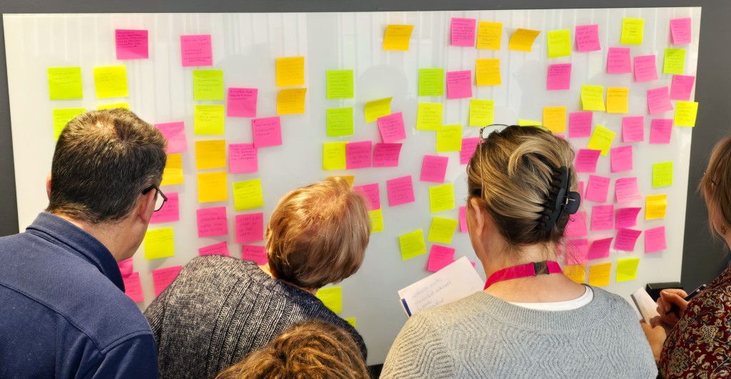 Yksilötehtävässä jokainen kirjoitti Post-it -lapuille ideoita . Ryhmissä ideoista muodostettiin tavoitteita, joille laadittiin toimenpidesuunnitelmia, joissa ”Kaikki liittyy kaikkeen”.