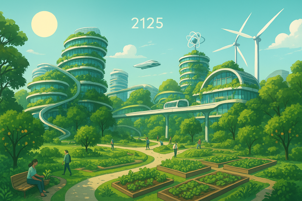 Vuonna 2125 rakennettu ympäristö on osa elävää ekosysteemiä, jossa ihminen, luonto ja teknologia toimivat symbioosissa. Kaupungit eivät ole enää tiivistä betonia vaan vihreitä, joustavia ja omavaraisia yhteisöjä, jotka tuottavat oman energiansa, puhdistavat vetensä ja kierrättävät kaiken materiaalin.